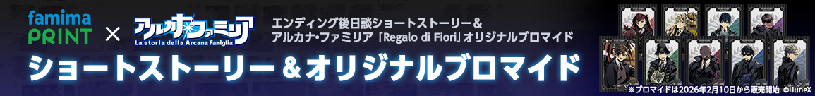 ■ファミマプリントにてアルカナ・ファミリア周年記念イラスト -Regalo di Fiori- オリジナルブロマイド&証明写真風シールの販売が開始されました。【URL】
